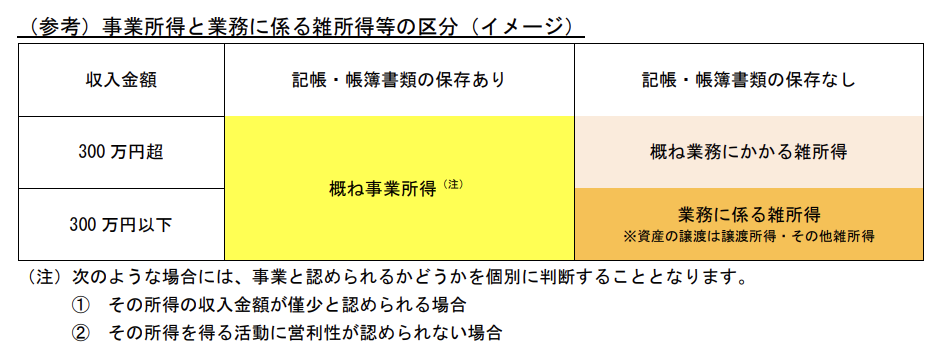 先の記事で、業務委託契約において報酬を受け取った時に、それが「事業所得」にあたるのか「雑所得」にあたるのかという点を検討しました。この区分は、自分でモノやサービスを販売する場合でも基本的には同じです。改めて、事業所得と雑所得の違いと、国税庁が提示している「事業所得と業務に係る雑所得等の区分」について掲載します。