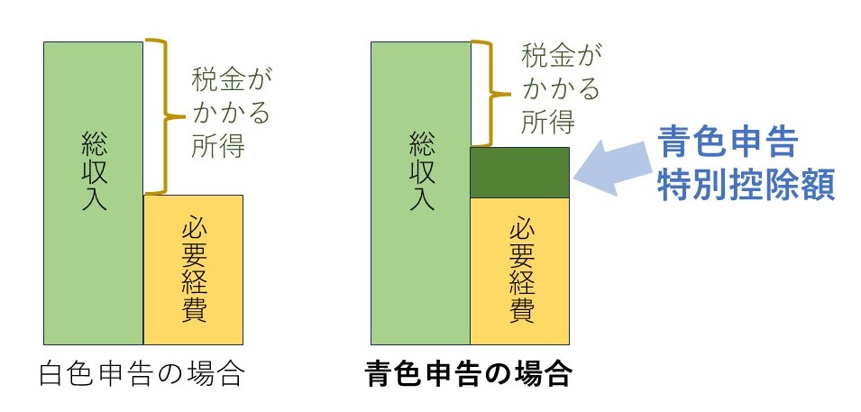 これが「青色申告といえば」とも言える最も有名な特典です。先ほど、「税金的には経費が多く、利益が少ない方がお得になる」とお伝えしましたが、この「青色申告特別控除」は利益を更に少なくし、税金を減らす効果があります。ざっくりとしたイメージは次のようなものです。